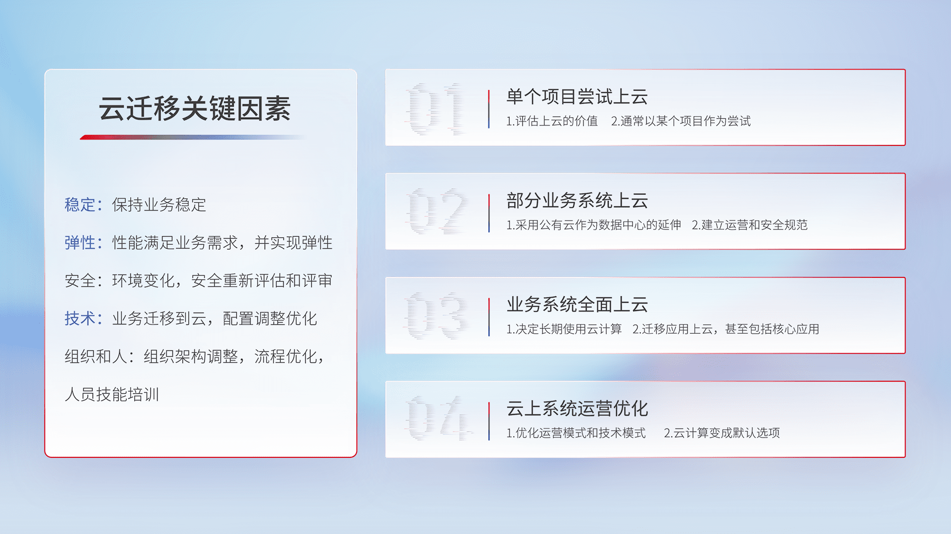 结合实际业务,,,,从规划设计、、云平台选型、、、、云原生改造、、、、数据迁移、、、集成交付,,,迁移全过程为客户识别最佳上云路径,,,做好风险识别管理,,,设计网络架构、、、、身份权限、、、安全审计合规、、、操作审计、、、日志审计、、、、监控告警策略、、、、多站点容灾设计等,,对云上基础设施进行整体规划,,,提升IT治理水平,,以满足弹性、、、、高可用、、、、高性能的需求。。。